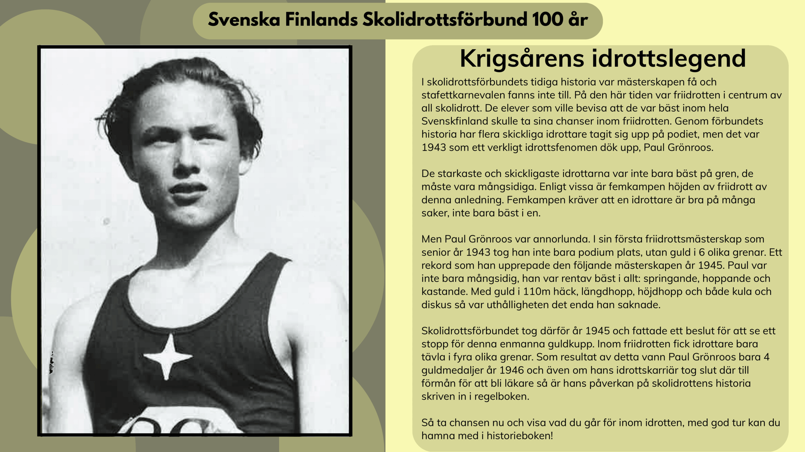 I skolidrottsförbundets tidiga historia var mästerskapen få och stafettkarnevalen fanns inte till. På den här tiden var friidrotten i centrum av all skolidrott. De elever som ville bevisa att de var bäst inom hela Svenskfinland skulle ta sina chanser inom friidrotten. Genom förbundets historia har flera skickliga idrottare tagit sig upp på podiet, men det var 1943 som ett verkligt idrottsfenomen dök upp, Paul Grönroos.